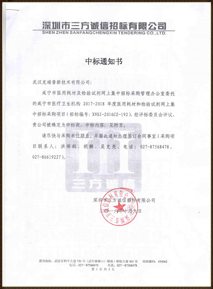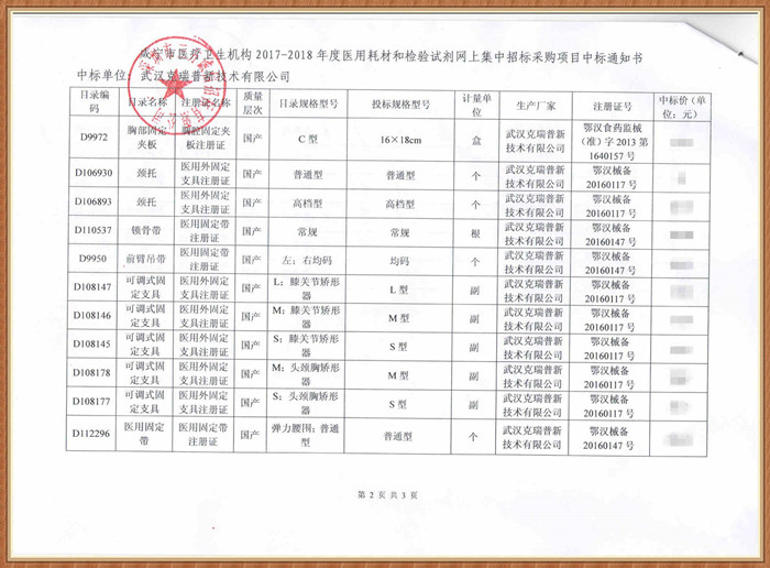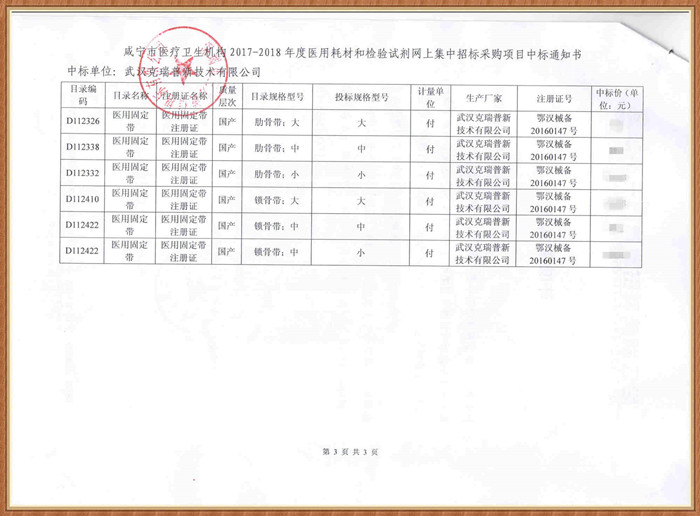 【湖北省咸寧市醫(yī)療衛(wèi)生機構(gòu)2017-2018年度醫(yī)用耗材和檢驗試劑網(wǎng)上集中招標采購項目】在咸寧市醫(yī)療衛(wèi)生醫(yī)用耗材采購招投標計劃中,我們武漢克瑞普經(jīng)評標委員會評議過程后成功被確定為中標商,我們中標的骨科耗材醫(yī)用外固定支具類產(chǎn)品以及胸部固定夾板,產(chǎn)品已在各大醫(yī)院和經(jīng)銷商采取的了臨床使用。