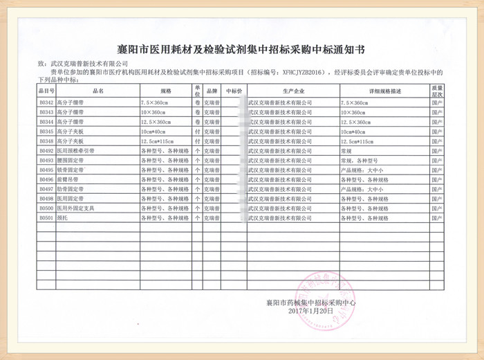 【湖北省襄陽市醫(yī)用耗材及檢驗試劑集中招標采購中標通知書】武漢克瑞普新技術(shù)有限公司在參加襄陽市醫(yī)療機構(gòu)醫(yī)用耗材集中招標采購項目中經(jīng)評定我們公司已成功中標,我們的中標產(chǎn)品有高分子繃帶、高分子夾板、醫(yī)用外固定支具等多種骨科耗材產(chǎn)品,我們的骨科耗材系列產(chǎn)品都有國家出具的證書全套的資質(zhì)齊全,可適用于胸外科、骨科、急診科、理療科、整形科、120急救等。