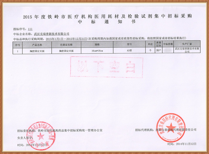 【遼寧省2015年度鐵嶺市醫(yī)療機(jī)構(gòu)醫(yī)用耗材及檢驗試劑集中招標(biāo)采購中標(biāo)通知書】我們東科圣康品牌的胸腔固定夾板術(shù)前術(shù)后外固定耗材在2015年度鐵嶺市醫(yī)療機(jī)構(gòu)集中采購中已成功中標(biāo),中標(biāo)價格較為優(yōu)惠產(chǎn)品醫(yī)生操作起來比較簡單,而且可以提升接診率,產(chǎn)品輕便舒適等特點。