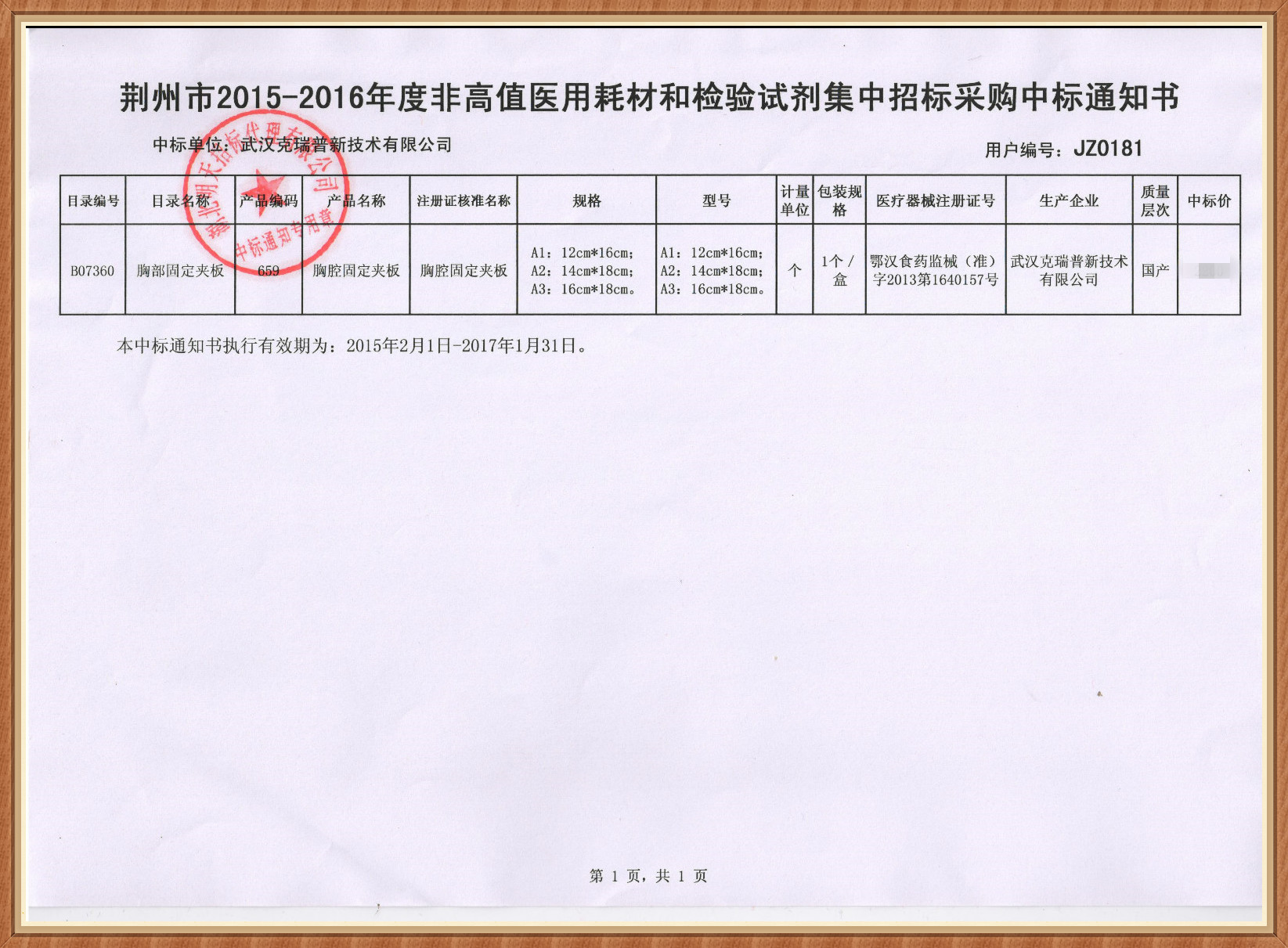 【湖北省荊州市2015-2016年度非高值醫(yī)用耗材和檢驗(yàn)試劑集中招標(biāo)采購中標(biāo)通知書】武漢克瑞普新技術(shù)有限公司在荊州市醫(yī)療機(jī)構(gòu)非高值醫(yī)用耗材和檢驗(yàn)試劑集中招標(biāo)采購項(xiàng)目中我司經(jīng)評標(biāo)委員會的評審決定成功獲得了中標(biāo)的資格,我們本次中標(biāo)的產(chǎn)品是我廠家較為關(guān)注的一款產(chǎn)品那就是我們的東科圣康品牌的胸腔固定夾板產(chǎn)品,這款產(chǎn)品在醫(yī)院以臨床使用中較為良好,我們歡迎各大經(jīng)銷商與我們?nèi)〉煤献鳌?/span>