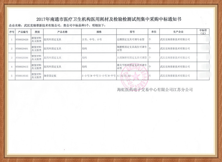 【江蘇省2017年南通市醫(yī)療衛(wèi)生機(jī)構(gòu)醫(yī)用耗材及檢驗(yàn)測(cè)試劑集中采購(gòu)中標(biāo)通知書(shū)】我們2017年在南通經(jīng)過(guò)我們招標(biāo)的同事辛苦的努力下在南通市衛(wèi)生機(jī)構(gòu)醫(yī)用耗材集中采購(gòu)招標(biāo)項(xiàng)目中我們的東科圣康品牌醫(yī)用外固定支具以及由我們武漢克瑞普出品的胸骨固定板均成功中標(biāo),產(chǎn)品為一類的骨科外固定耗材,產(chǎn)品適用于胸外科、骨科、急診科、理療科、整形科、120急救等。