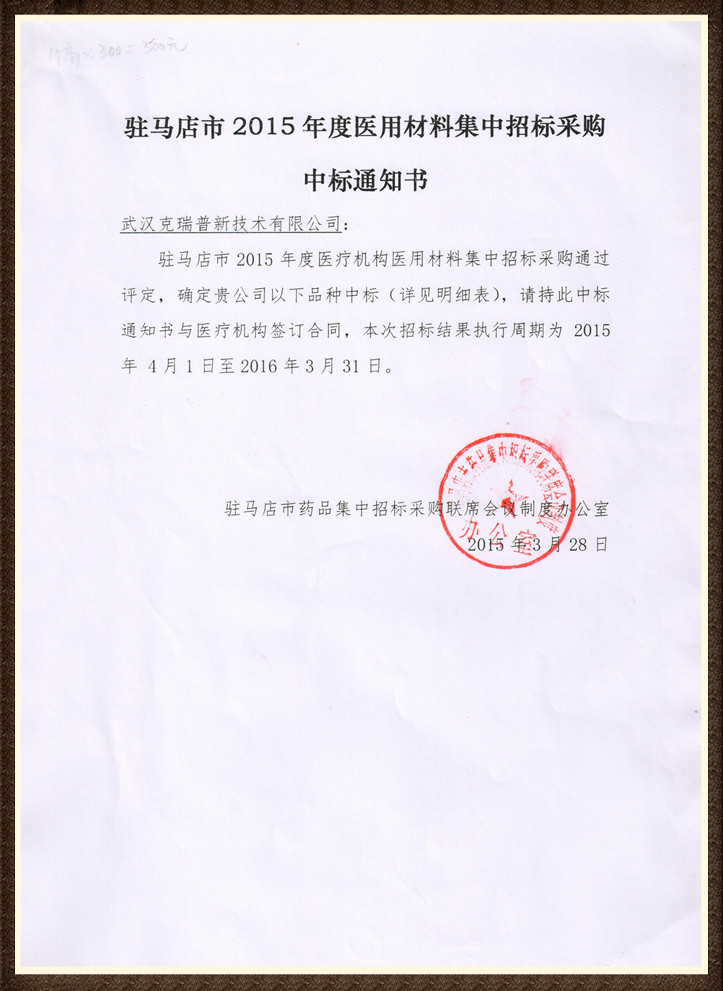 (駐馬店市2015年度醫(yī)用材料集中招標采購中標通知書)